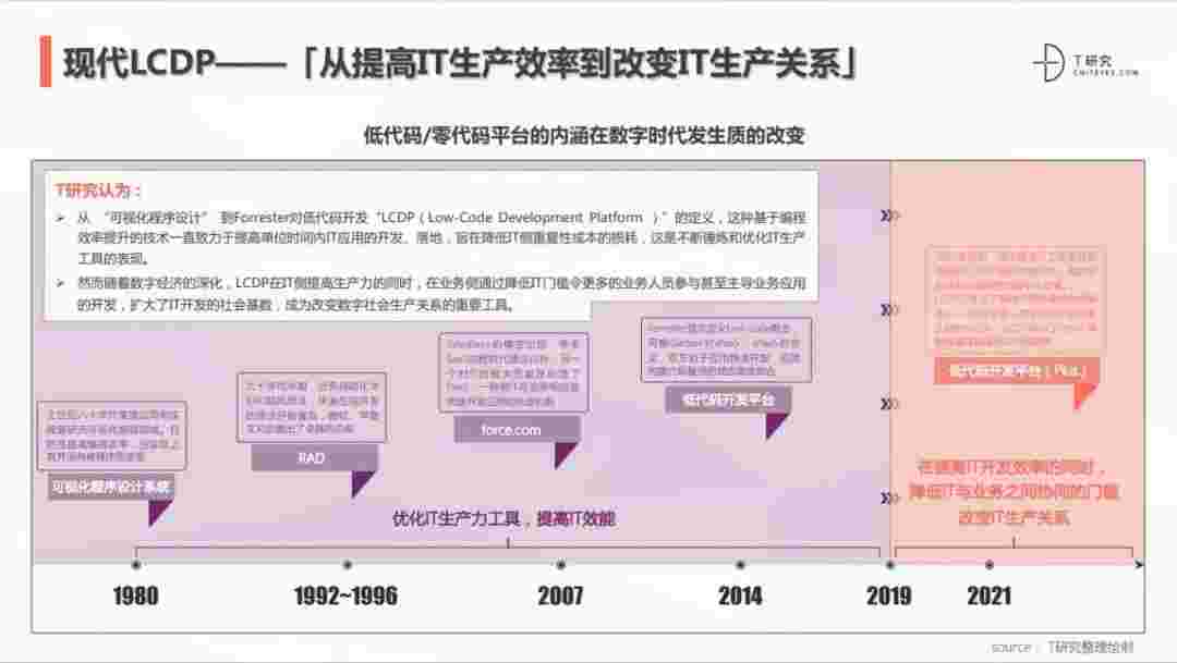 2020年前后,,,,源于提高IT工作者开发效能的LCDP不断进化和衍生,,面对业务导向日益明显的数字化变革。。LCDP衍生出了面向不同对象的升级服务——面向专业人群的LCDP和业务人群的NCDP,,,LCDP与NCDP的不同服务属性被逐渐认可和接受。。 LCDP在提高IT开发效率的同时,,,降低IT与业务之间协同的门槛改变IT生产关系。。